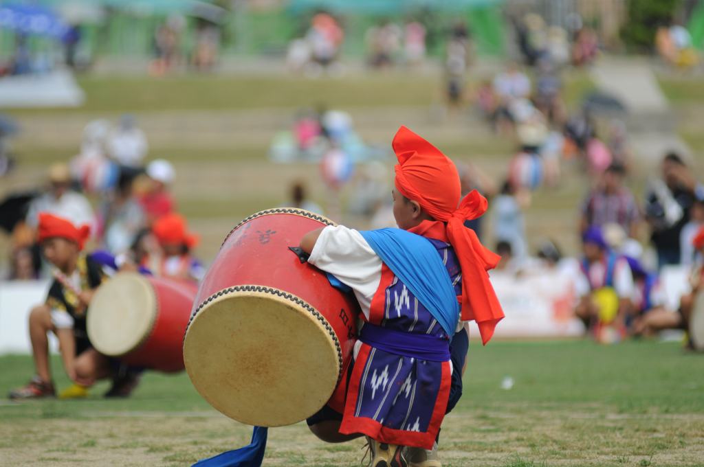 Youth performers prepare for their dance and drum number at the 58th Okinawa Zento Eisa Matsuri contest in Okinawa City, Okinawa, Sept. 1. Lisa Tourtelot/Stars and Stripes