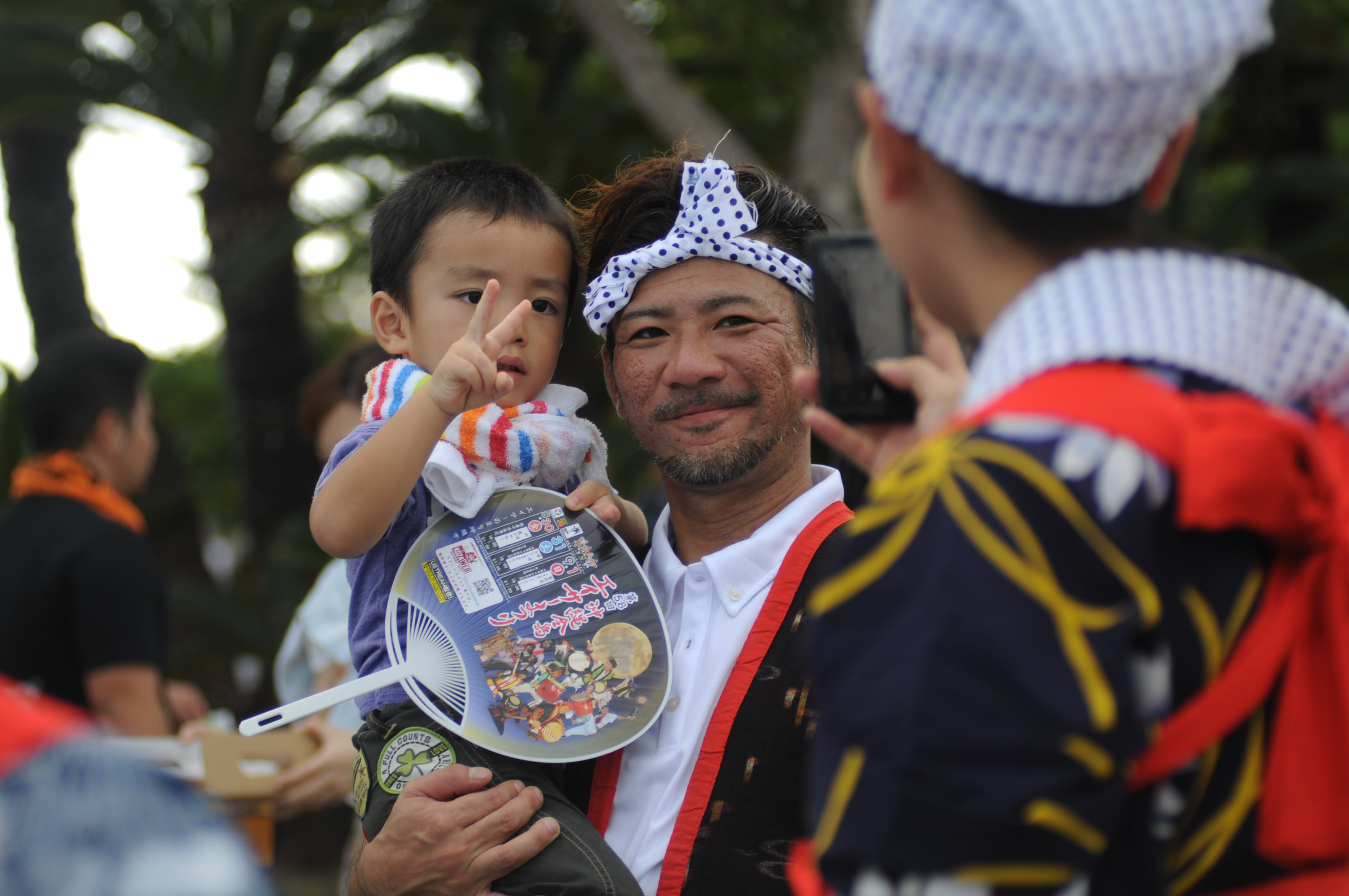 A performer pauses to take a picture with a young fan at the 58th Okinawa Zento Eisa Matsuri contest in Okinawa City, Okinawa, Sept. 1. Lisa Tourtelot/Stars and Stripes