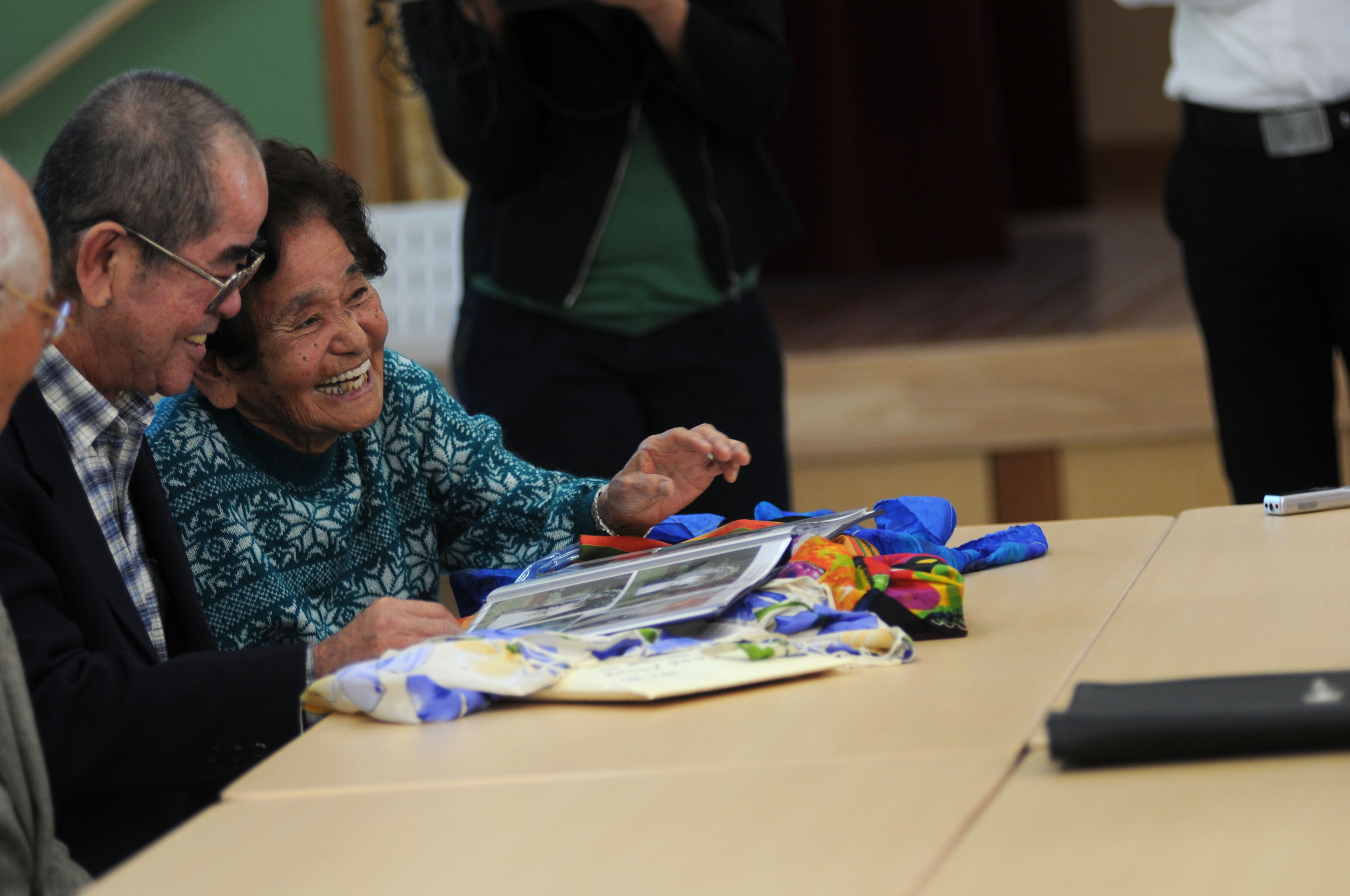 Masako “Iha” Sunabe and her nephew, Katsuhide Sunabe, browse their family’s photo album for the first time in almost 70 years following an official return of the item in Chatan, Okinawa, Jan. 12, 2014. (Lisa Tourtelot/Stars and Stripes)