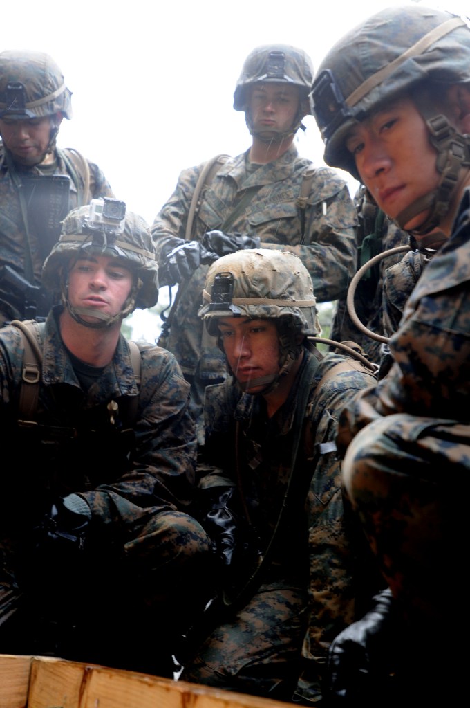Marines with India Company, 3rd Battalion, 1st Marines, memorize the contents of a”Kim’s” box between obstacles during the endurance course at the Jungle Warfare Training Center at Camp Gonsalves, Okinawa, Feb. 12, 2014. Kim’s games test observation and memory and are used by children’s scouting groups and the military alike. (Lisa Tourtelot/Stars and Stripes)