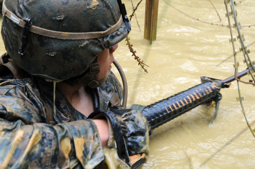A Marine with India Company, 3rd Battalion, 1st Marines, uses his rifle to manuever under a razor wire obstacle during the four-hour endurance course at the Jungle Warfare Training Center at Camp Gonsalves, Okinawa, Feb. 12, 2014. (Lisa Tourtelot/Stars and Stripes)