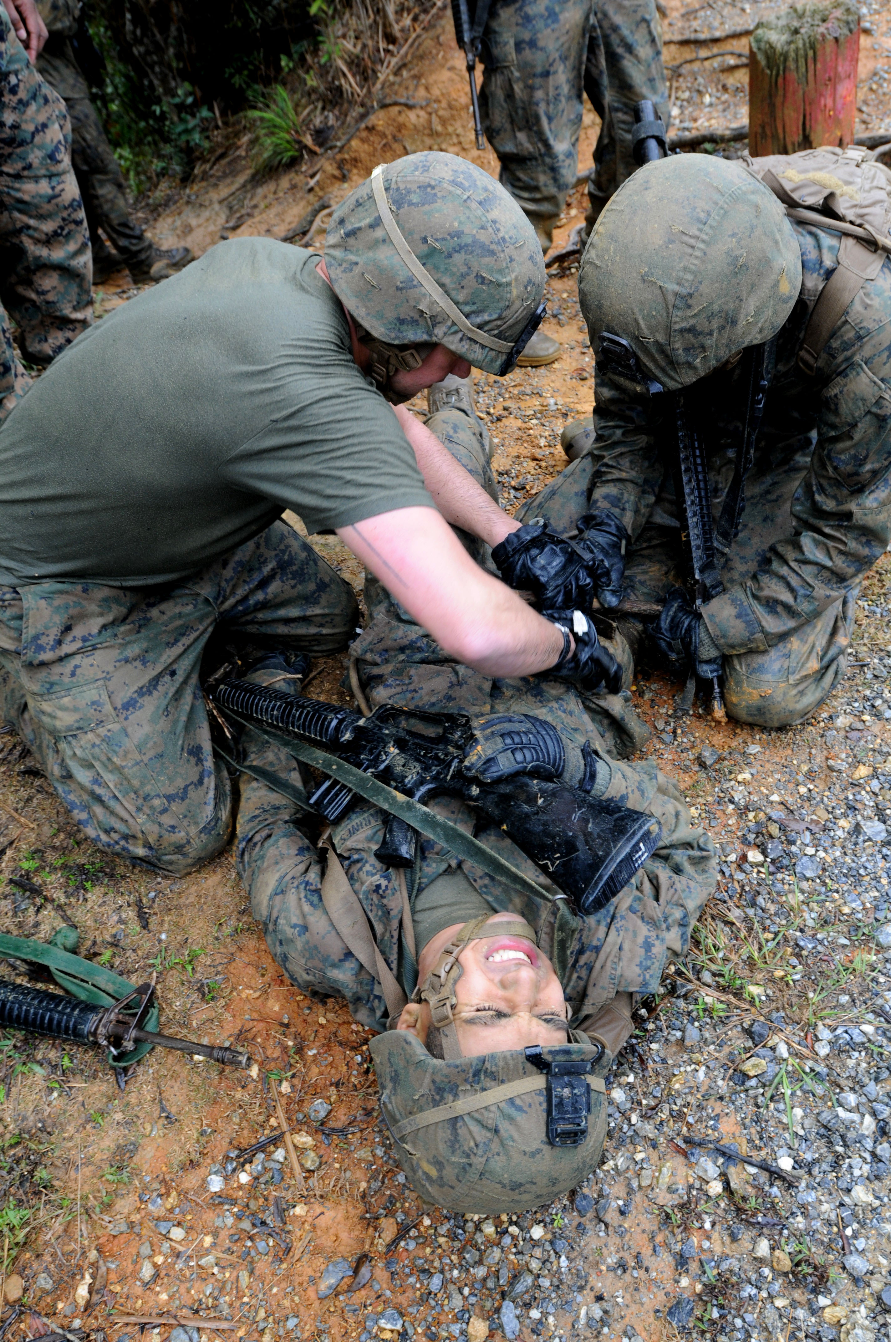 Marines with India Company, 3rd Battalion, 1st Marines, practice a makeshift tourniquet during the four-hour endurace course at the Jungle Warfare Training Center at Camp Gonsalves, Okinawa, Feb. 12, 2014. (Lisa Tourtelot/Stars and Stripes)