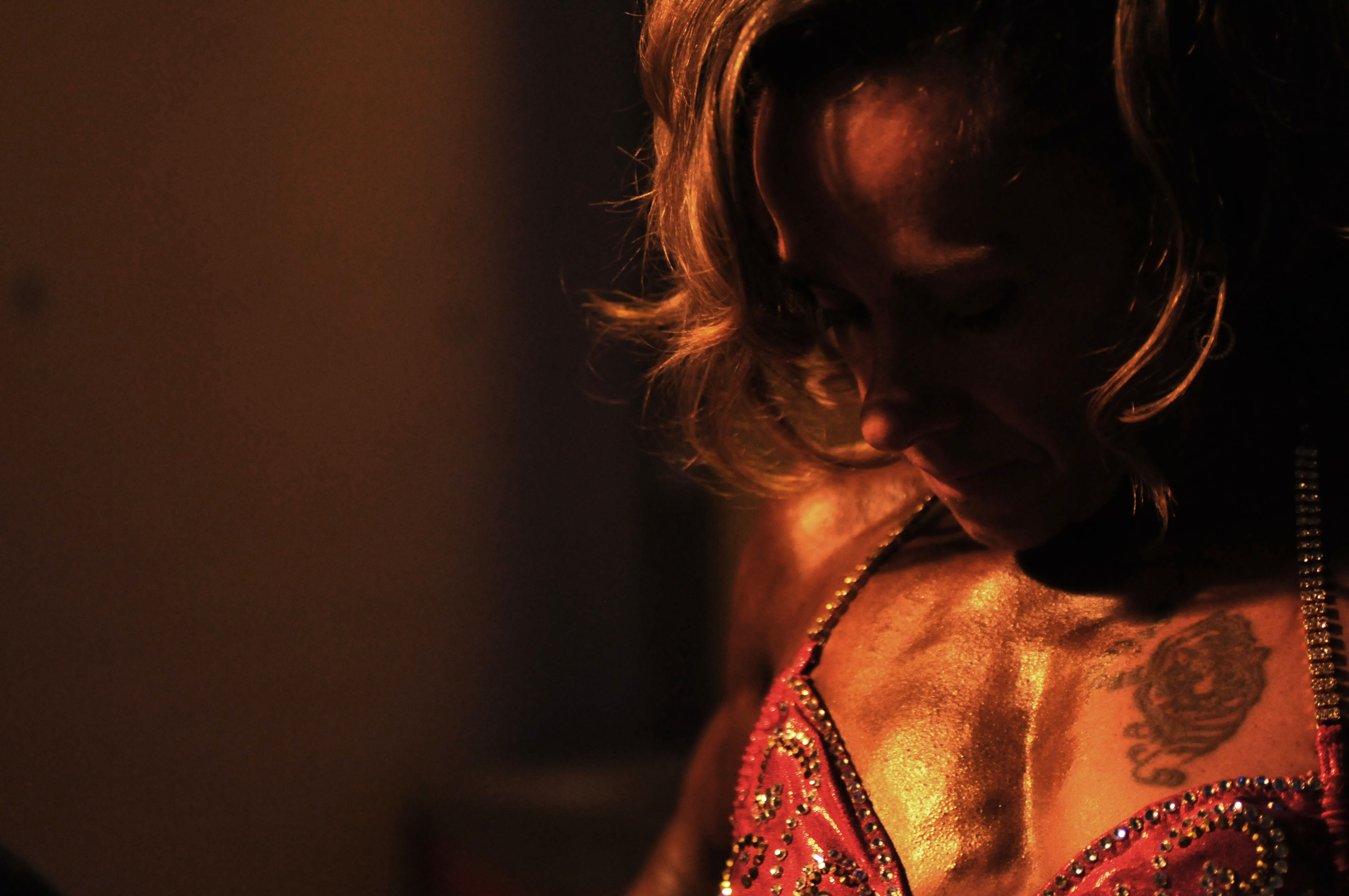 Christine Allen, the women’s bodybuilding overall champion, prepares backstage at the 8th annual Pacific Muscle Classic on Kadena Air Base, Okinawa, May 18, 2014. (Lisa Tourtelot/Stars and Stripes)