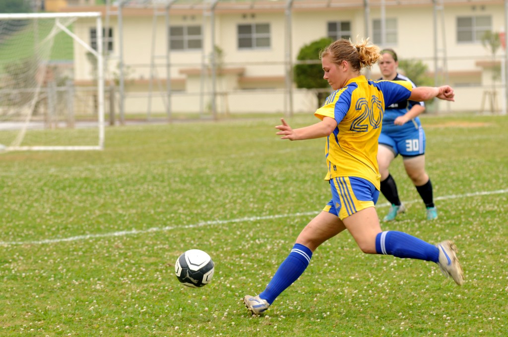Sarah Claypool, with the Yokota High School girl’s soccer team, attempts a scoring goal at the Far East Soccer Tournament aboard Camp Foster, Okinawa, May 19, 2014. The tournament is three days long and features soccer teams from across the Pacific. (Lisa Tourtelot/Stars and Stripes)