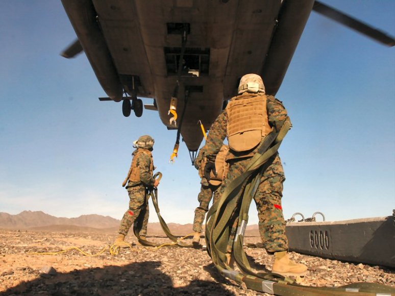 A CH-53E Super Stallion hovers just above a helicopter support team, as they attach several thousand pounds of weight to the aircraft. The Super Stallion is the only helicopter in the military that can lift its own weight.
