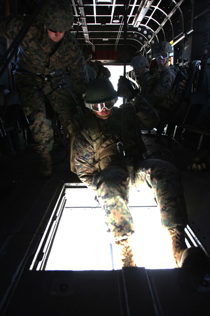 A Recon Marine prepares to slide out of the "hellhole" of a CH-53E Super Stallion hovering approximately 80 feet from the ground.