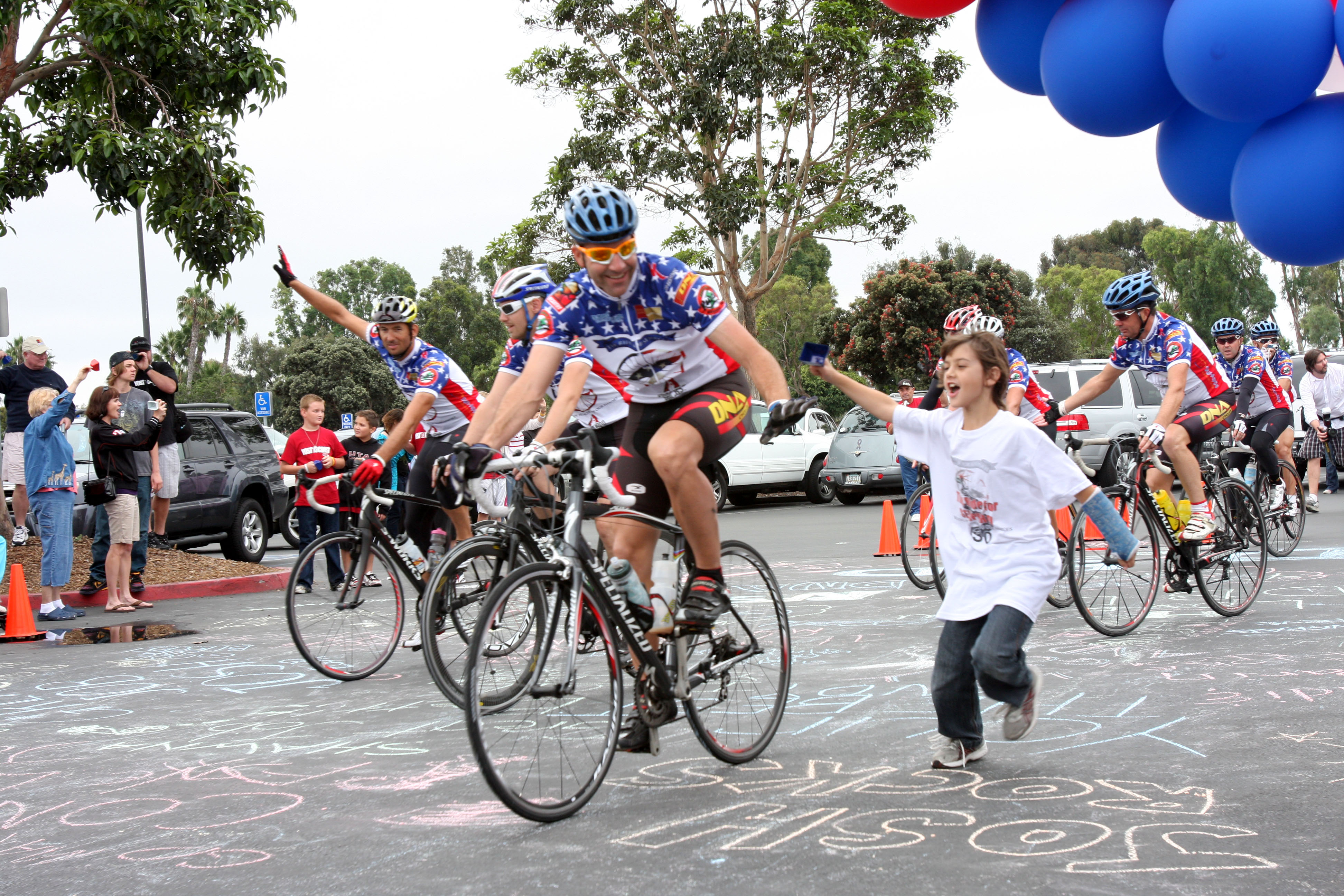 Nine-year-old Maxwell Merick of Phoenix runs to great his dad, Phil, as he crosses the finish line in San Diego for The Ride for Semper Fi. Participants in the ride raised $250,000 to support injured Marines and their families and cycled 430 miles from Phoenix.