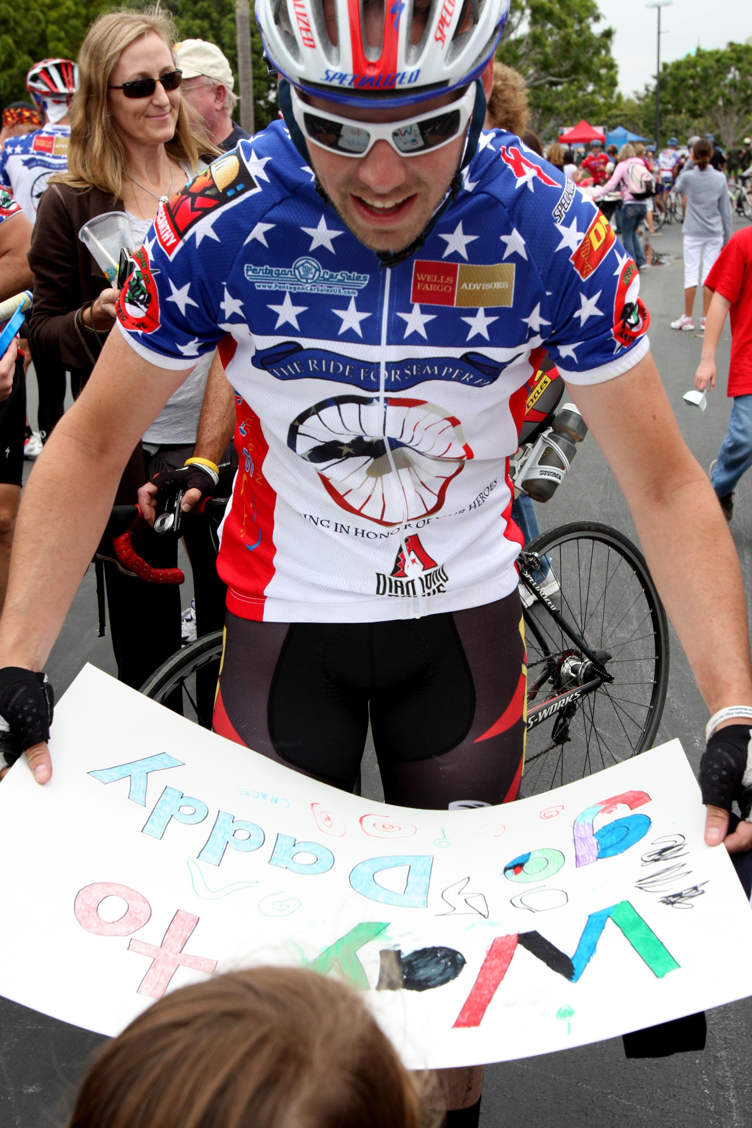 Ryan Blythe, a fit specialist for DNA Cycles in Mesa, Ariz., gets his “way to go” from his daughters after completed the 430-mile trek from Phoenix to San Diego for The Ride for Semper Fi. The ride raised $250,000 for the Semper Fi Fund, which supports injured Marines and their families.
