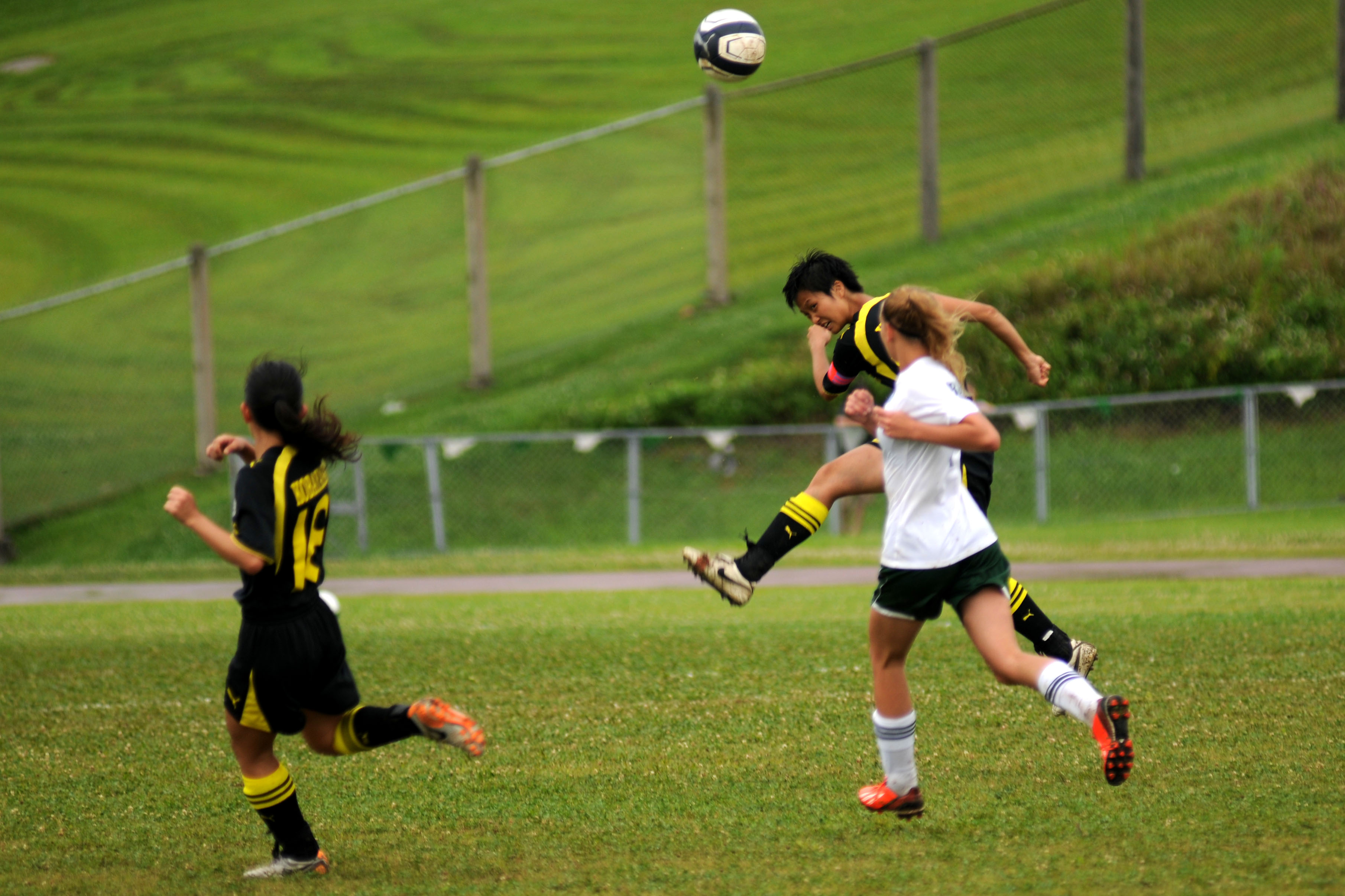 ASIJ’s Joey Yamada leaps into a kick at the Division 1 girl’s soccer championship on Camp Foster, Okinawa, May 22, 2014. (Lisa Tourtelot/Stars and Stripes)