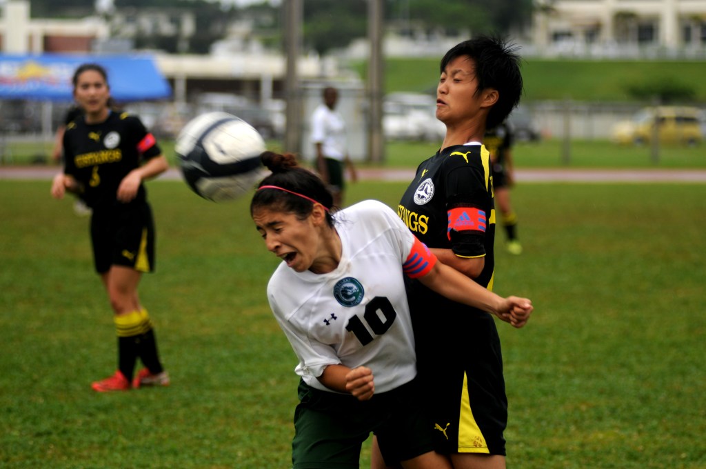 Kubasaki’s Marissa Mesquita beats ASIJ’s Joey Yamada to a head butt at the Division 1 girl’s soccer championship on Camp Foster, Okinawa, May 22, 2014. (Lisa Tourtelot/Stars and Stripes)