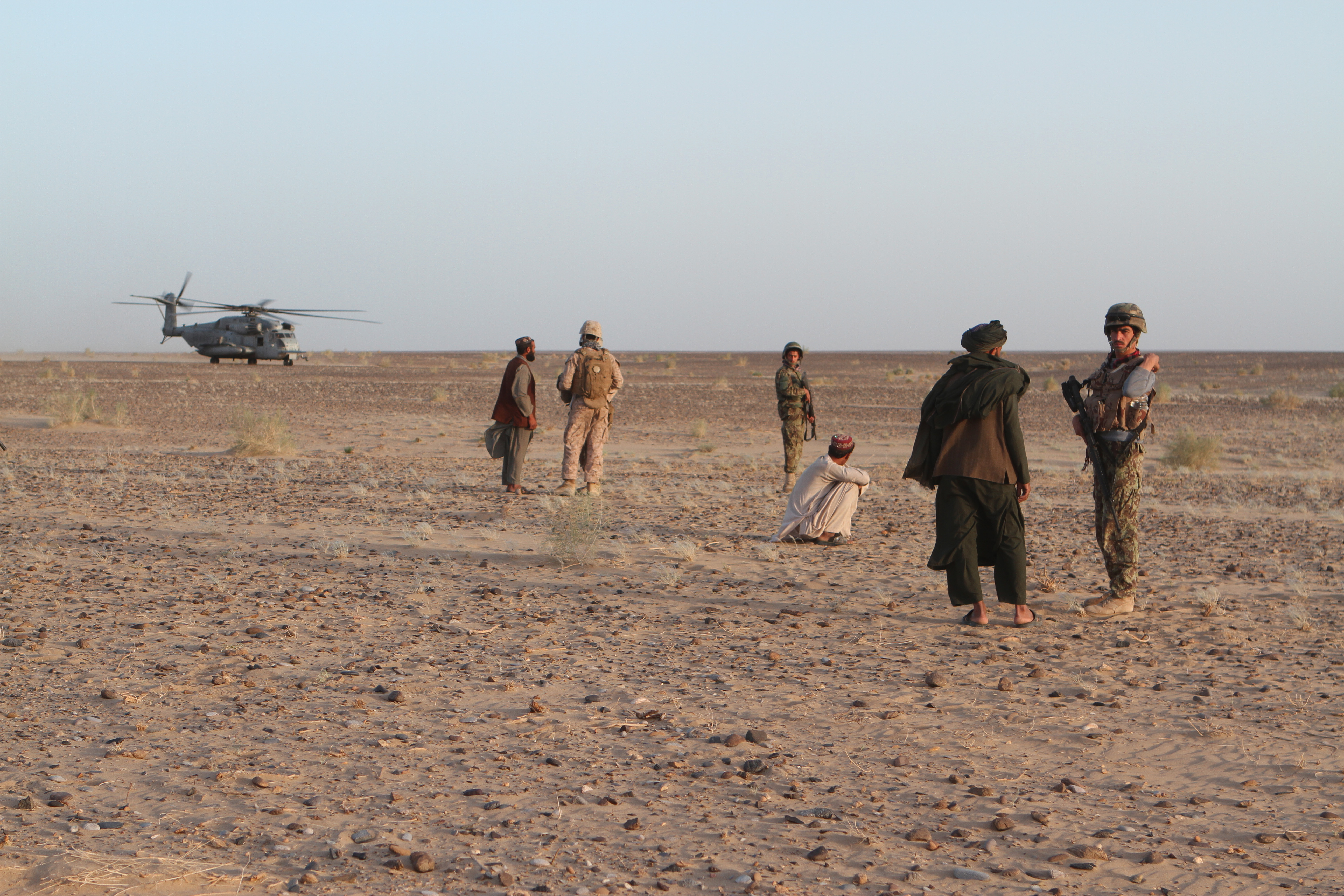 Marines with Regimental Combat Team 5 and members of the Afghan National Army’s military police question local Afghans in southwestern Afghanistan May 17. Marine Heavy Helicopter Squadron 466 supported vehicle interdiction operations, searching for potential drug traffickers in the area.