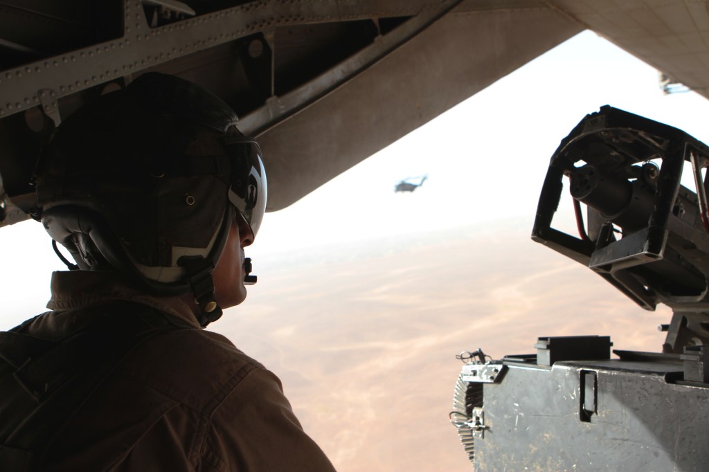 Sgt. Enrique Zamora, a crew chief with Marine Heavy Helicopter Squadron 466, ensures that his .50-caliber machine gun never points at the other CH-53E Super Stallion in his flight section over southwestern Afghanistan May 17. The squadron flew Marines with Regimental Combat Team 5 and members of the Afghan National Army’s military police to perform vehicle interdictions along known drug trafficking routes.
