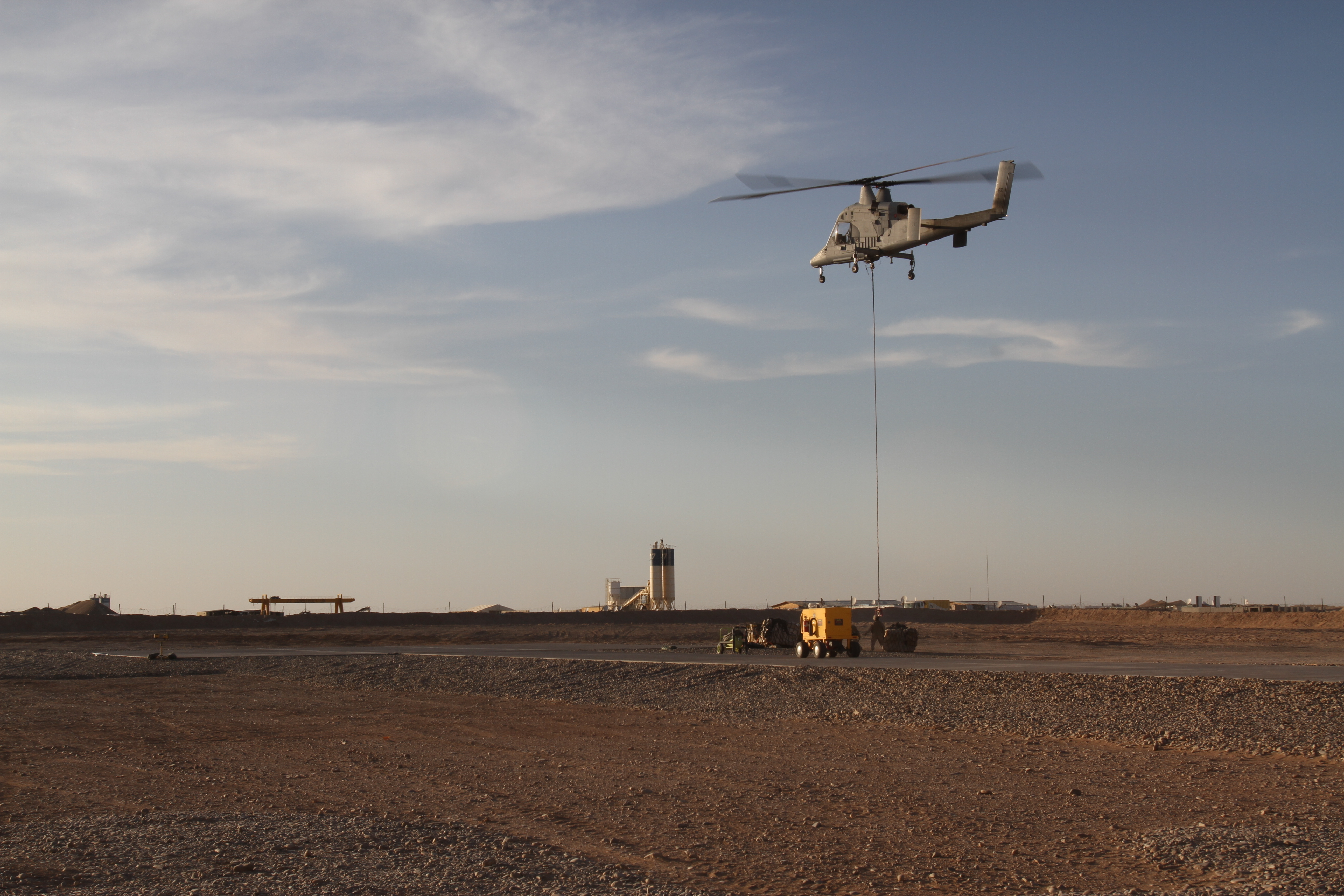 HELMAND PROVINCE, Afghanistan – Marine Unmanned Aerial Vehicle Squadron 2, the “Night Owls,” made history earlier this week when they completed the first “hot hookups” between landing support Marines on the ground and a hovering Kaman K1200, “K-MAX,” unmanned helicopter in Helmand province, Afghanistan, May 22.